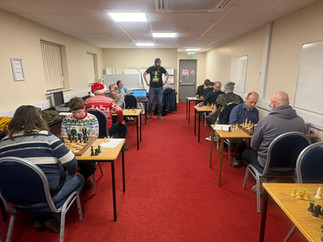 The annual Christmas Crazy Tournament took place on Tuesday 16th December and the result was the usual highly enjoyable chaos. This year, along with the usual time handicap system (the 20 minutes per game is allocated according to the grades of the two players, so it could be 10 minutes each if of equivalent grade or up to 17 minutes to 3 minutes if the grades are further apart), Matt introduced 'War and Pieces'.