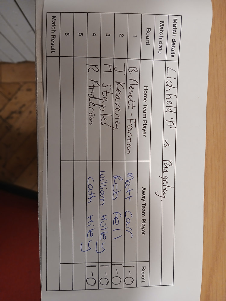 The final result was 4-0 to the home side, but the emphatic victory didn't quite tell the full story. Both myself & Cath (boards 2 & 4) had lively encounters, forcing our opponents on the backfoot but ultimately falling short in the endgame. Bill on board 3 seemed to be a match for his opponent, but a rook against 3 connected pawns forced a resignation right at the end. Matt on board 1 gave a really good account of himself, causing his opponent all sorts of problems which resulted in extreme time pressure for the home player. Unfortunately a mistake right at the end with Matt's pawn position proved costly. So a difficult night, but some really entertaining close games nevertheless.
